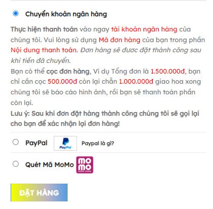 Nếu bạn đã chọn thanh toán bằng thẻ tín dụng/debit hoặc PayPal, MoMo, bạn sẽ được chuyển đến trang thanh toán an toàn để nhập thông tin thanh toán. Sau khi thanh toán thành công, đơn hàng của bạn sẽ được xử lý và chúng tôi sẽ gửi thông tin vận chuyển đến bạn qua email.